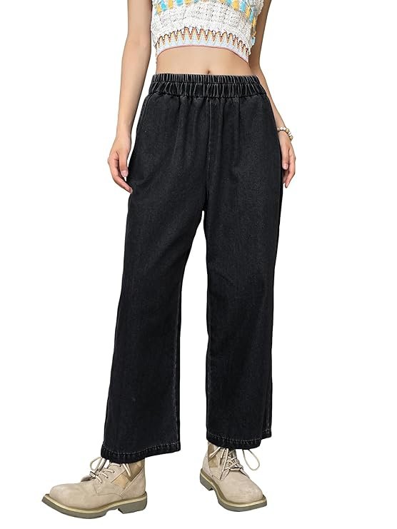 Women’s High-Waist Wide Leg Denim Pants, Elastic Waist, Ankle Length, Cotton, Casual